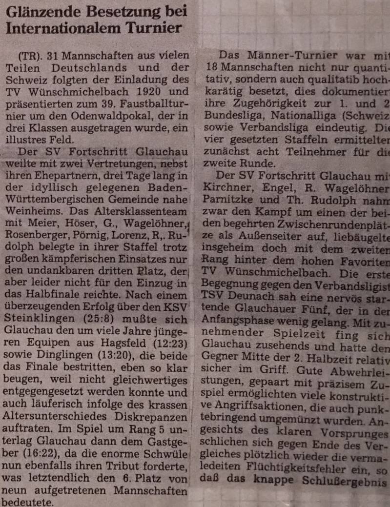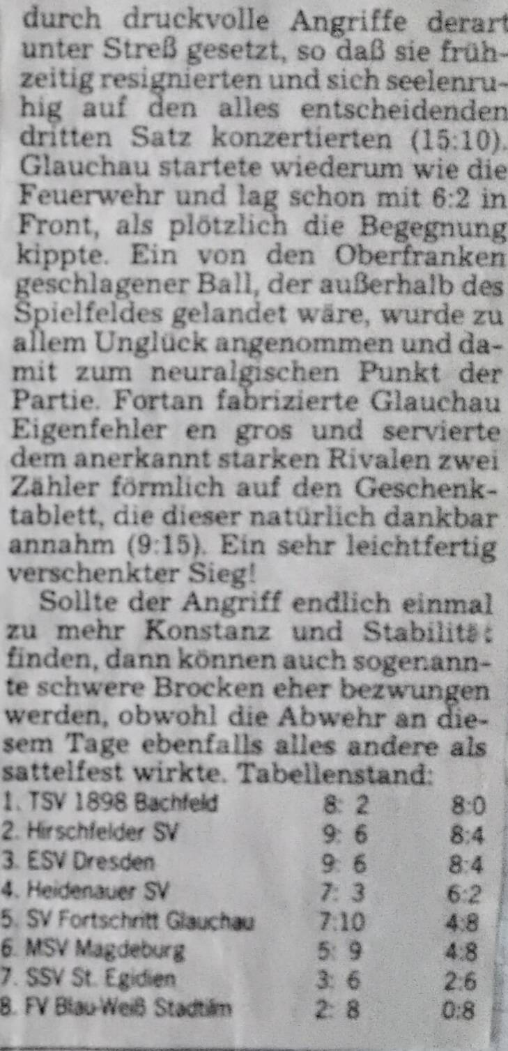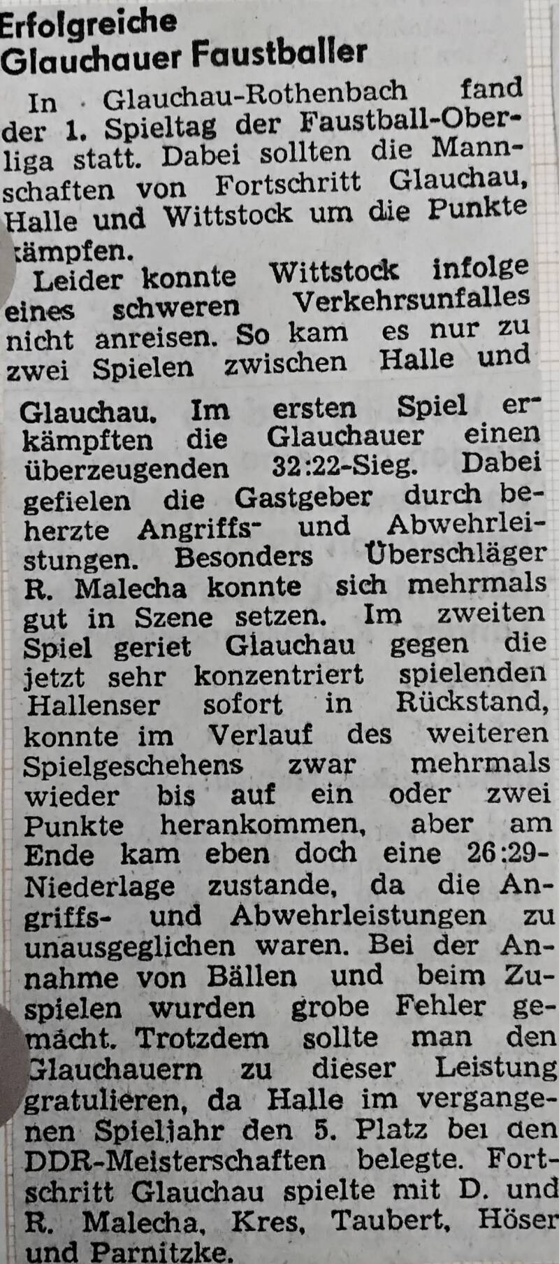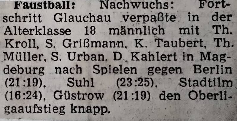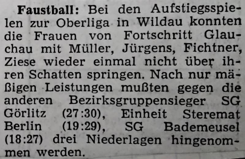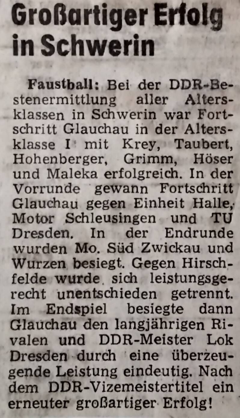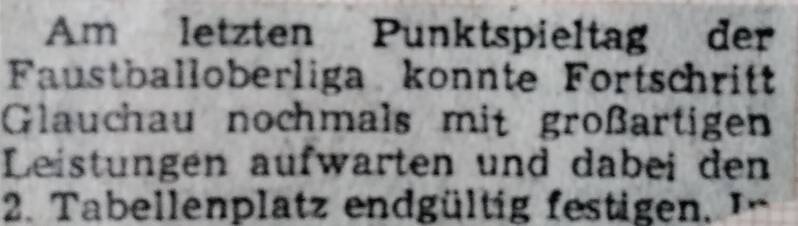 - 1950 wurden die Faustballer des TV Rothenbach von der Betriebsgemeinschaft (BSG) ,,Fortschritt" Glauchau übernommen. Trägerbetrieb war die VE Weberei Einheit/Palla. Dort in der Zentrale waren alle Sektionen bei den Sortfreunden Ernst Opitz, Heinz Zenker und ab 1972 Dieter Stock in festen Händen.