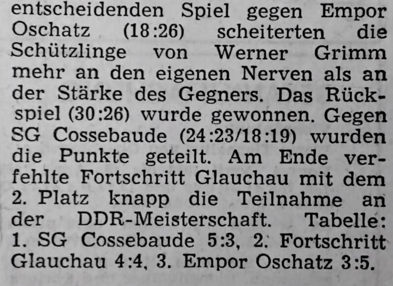 - Eine von den jüngeren Mannschaften bildete sich mit Günther Steinbach, Gotthard Grimm, Günter Pätzold, Karl-Heinz Kirmse, Hans Schneider, Wolfgang Kolbe ein erstes schlagkräftiges Team, was sich im Bezirk Karl-Marx-Stadt Respekt verschaffte.